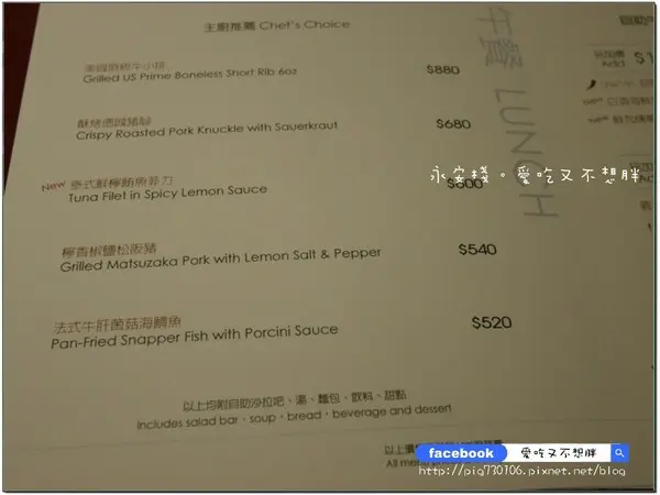 那如果想再對自已好一點的話,就可以點以下的主廚推薦餐點,只要下面的價位,一口價,就可以享用主餐及buffet,