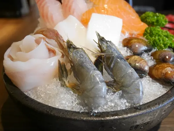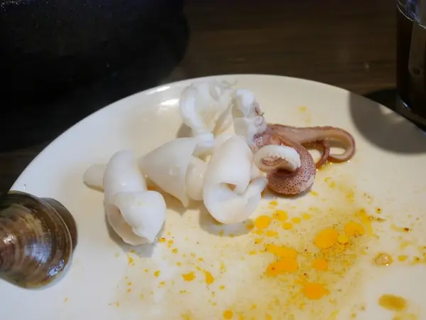 二人份的海鮮盤,種類很多,有透抽(捲成花的樣子超可愛)、藍蝦、曼波魚、鯛魚及蛤蜊。