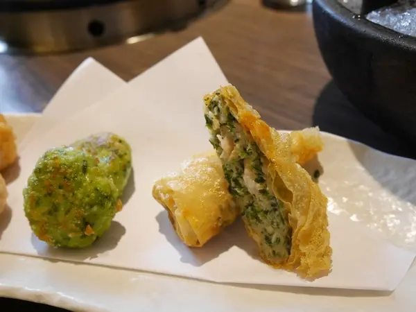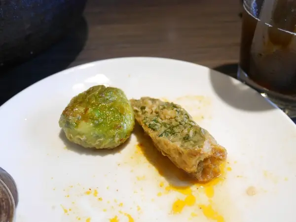 韭菜蝦仁裡頭好多汁,一口咬下就是滿滿的韭菜味,腐皮蝦捲的部分裡頭是香菜加上韭菜,吃起來也是香氣十足,而且口感好特別。