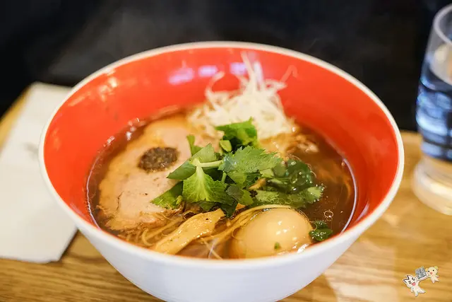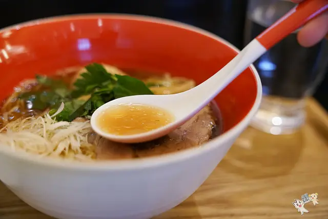 撥開如金般色澤的油珠,看似清澈的湯底卻顯現出醬油香與松露的迷人姿態、讓你不禁多喝上幾口,但我得說雞湯以及魚干的氣息不太鮮明