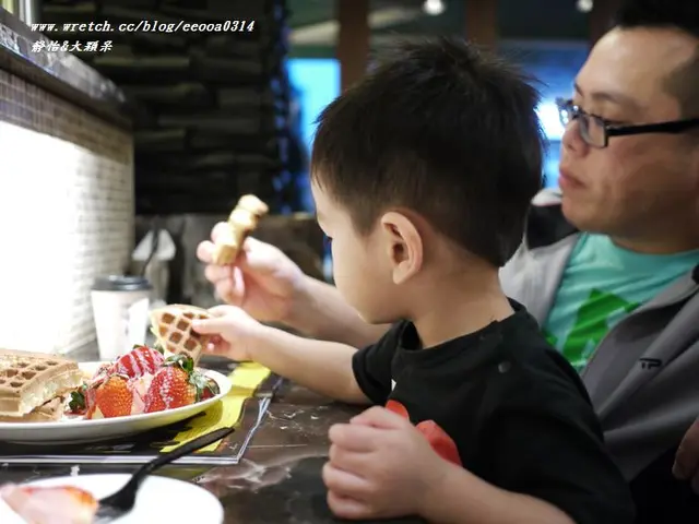 不過這小子挺聰明的,根本都只有舔冰淇淋及卡士達醬,鬆餅幾乎沒有咬到啦