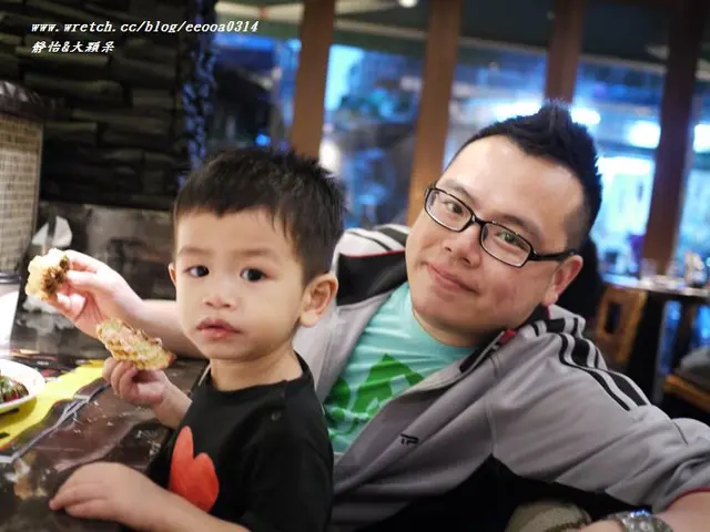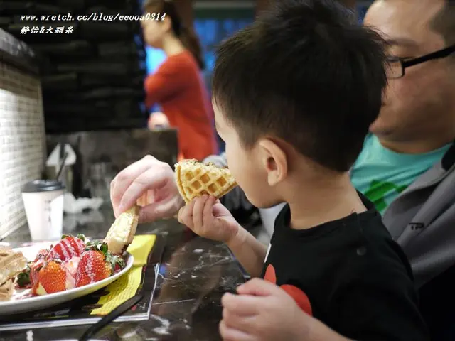 小恩仔像小大人一樣學我們一邊沾冰淇淋一邊吃鬆餅