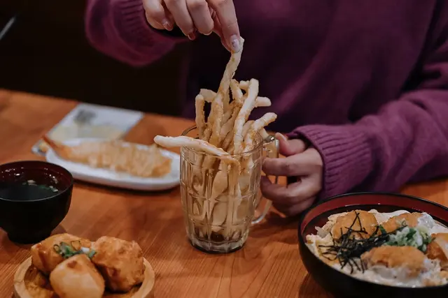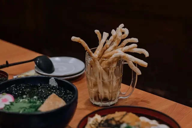 將烏龍麵裹上麵衣後油炸淋上黑糖蜜,看起來很像偽裝般的比較寬的鱈魚香絲,吃起來軟糯香甜,滿棒的創意吃法。