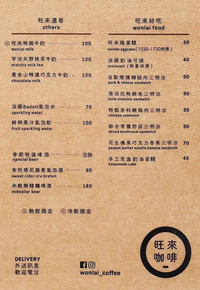 有冷熱飲也有販售可口的三明治,來旺來咖啡的客人大都是點上一杯咖啡配上一份旺來雞蛋糕,法國奶油可頌也是很熱門的品項。