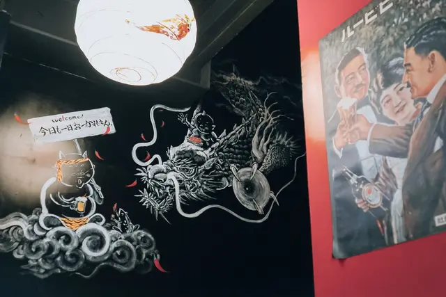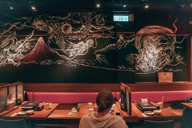 牆壁上大黑板手繪氣勢磅礡的風神、雷神及富士山,又同時展現出中國風的色彩相當震憾,又以自家赤味噌招牌畫出的可愛畫風,讓空間也是讓人會心一笑和協舒適的感受。