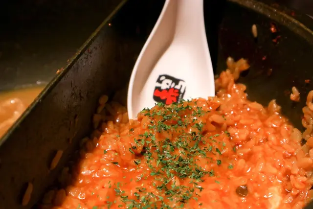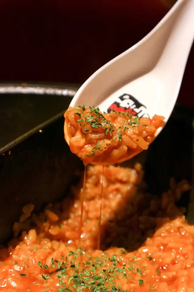 燉飯充滿了赤味噌的香氣與辣度,還有濃郁起司搭配,一口接一口停不下來,爽辣鹹香的獨特香氣,非常滿足且飽足。