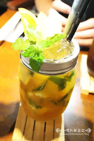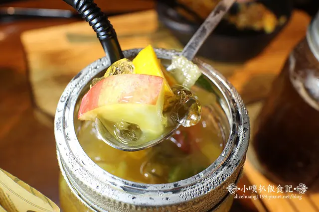 飲品上面覆蓋著許多薄荷葉,水果有:蘋果.檸檬.萊姆,喝起來略有甜味,是水果自然.清新的鮮果滋味,冰茶不會過甜,很有解膩效果,新鮮的水果香,冰冰涼涼很解暑氣!!