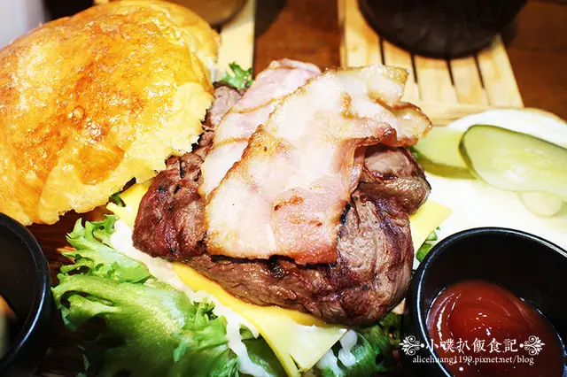 店家主張麵包及肉類都會以"直火碳烤"的方式烹煮,牛排肉感覺飽滿紮實,以"直火碳烤"方式烹飪,所以牛排有果木的焦香氣味,感覺味道富有層次且帶有點甜味,牛排大約7~8分熟,不會死硬難嚼,咀嚼起來軟嫩及帶有新鮮牛肉的肉質美味,搭配上面的培根一起入口,鮮嫩美味!!!