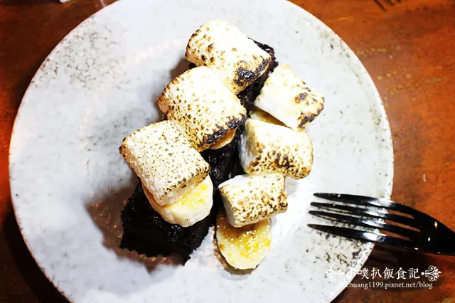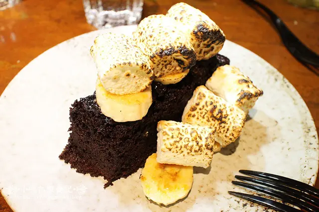 溫熱布朗尼上面覆蓋著香蕉及碳烤棉花糖,棉花糖還會牽絲呢!!!香蕉經過碳烤後與棉花糖之間,形成一片薄薄的結晶焦糖,感覺甜甜蜜蜜的,整體感覺很加分!!!
