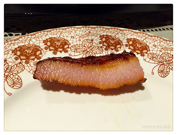 叉燒呈現嫩紅色,外皮裹了一層糖霜