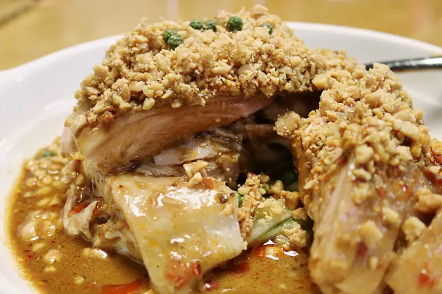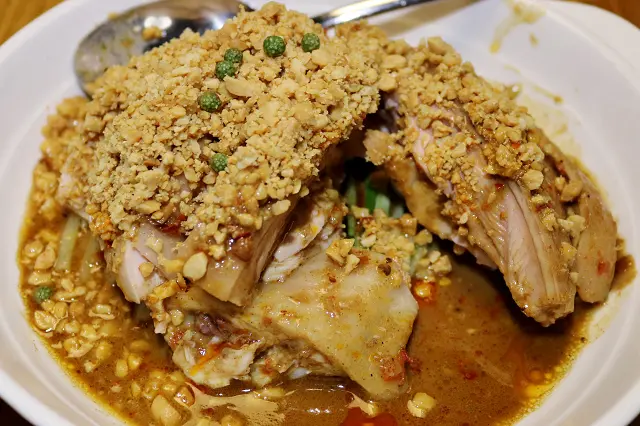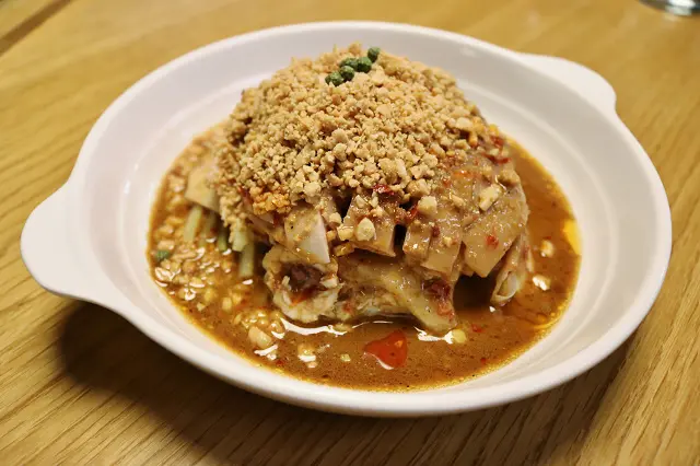 特選仿土雞淋上獨門芝麻醬汁與辣油,