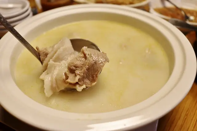 豬大骨慢熬八小時,加入五花肉與白蘿蔔一銅熬煮,