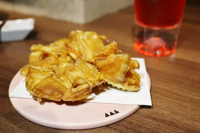個人比較推薦的有鱈魚蔥餅(下圖)、花枝排、九層塔黑輪、香菇燒,