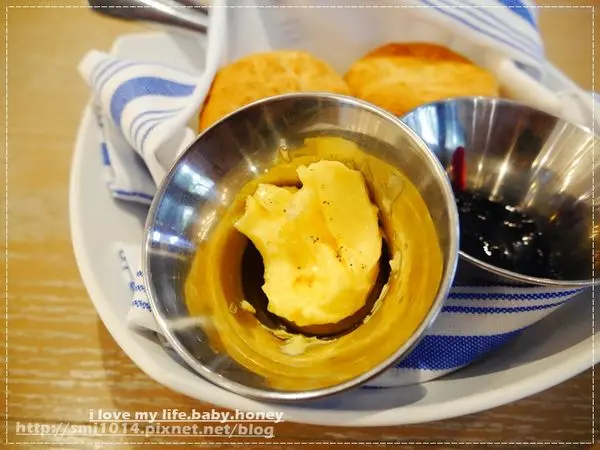 還附上回溫軟化的奶油跟自製新鮮藍莓醬兩種沾醬