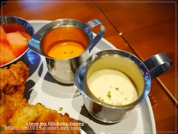 沾醬分兩種,紅的是霹靂紅辣醬,白的是蒜味白乳酪醬