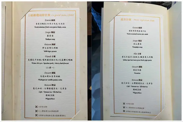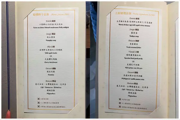 套餐包含:麵包、湯品、主餐、甜點、飲品