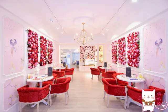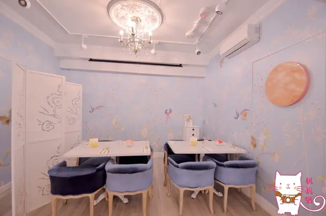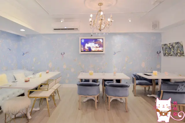 當然有了美麗的裝扮,也要有夢幻的場景襯托,VA VA VOOM餐廳裡的玫瑰花牆,水晶吊燈,亮紅色的座椅,粉藍色的花鳥彩繪牆,白色的毛皮沙發+金色餐具,水藍色的絨布沙發,無一不是IG打卡拍照的畫面,就連洗手間都很有fu啊!!