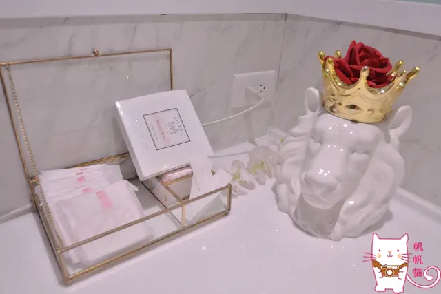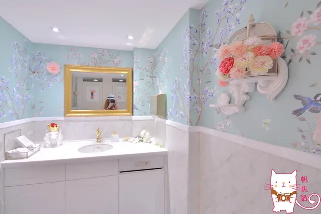 再往前才是粉藍花鳥牆面的洗手台跟廁所,洗手台上是VA VA VOOM貼心準備的棉棉兒,感覺像是自己的貼心好閨蜜來著。