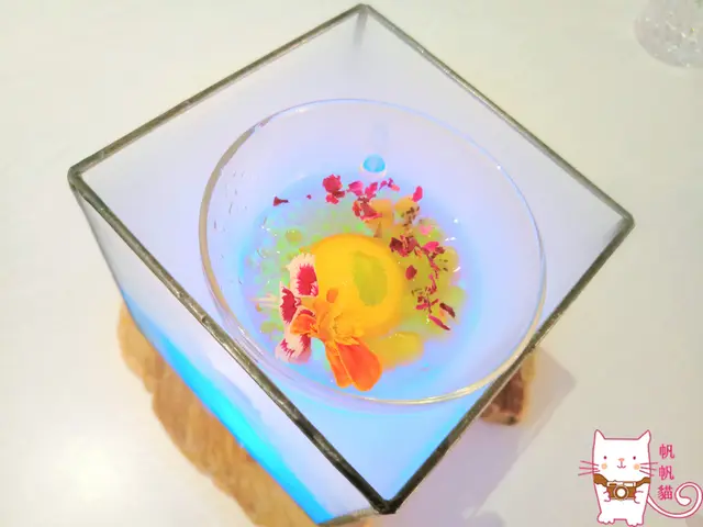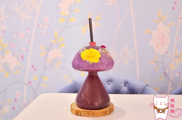 這杯紫色香菇形狀的叫做糖果毒藥,上面用黃花作為點綴,香菇頭外圍是糖粒,容器中則是特調的雞尾酒(白柑香甜酒、蝶豆花、仙人掌果、檸檬汁),建議先舔一點糖再吸裡面的雞尾酒來喝風味更佳,洞口則是不斷有乾冰冒出來,一直讓我想到超級瑪莉裡的香菇,不知道喝了會不會有什麼特殊技能?XD