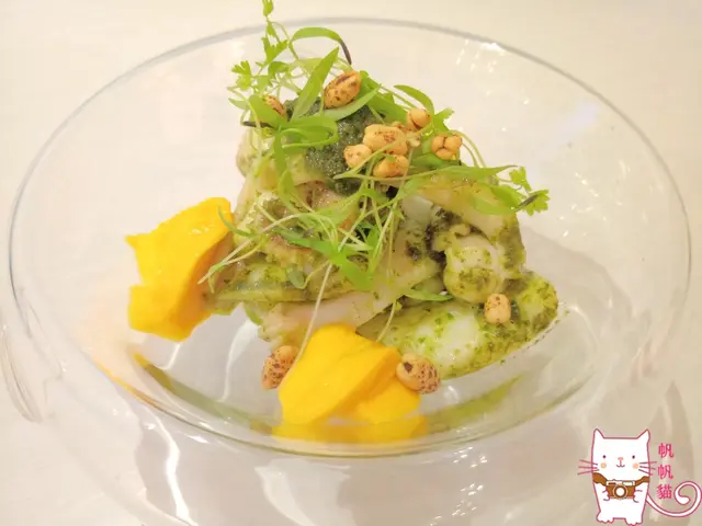 正當我們還在為飲料目眩神迷的時候,第一道菜蘿勒烤透抽上桌了,上面的青醬汁是主廚團隊嚴選的天然食材,在廚房手工現做而成,不是買半成品或成品,也不用化學香料,雖然這樣耗時耗工,但為了讓顧客吃到美味健康的料理,只好不惜成本。