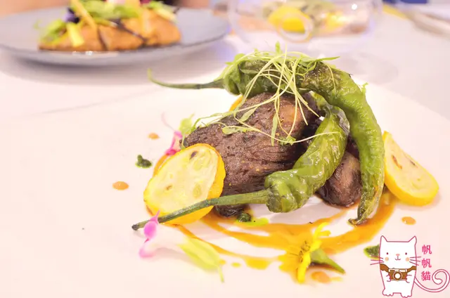 山椒牛小排的山椒厚實不辣烤得有點甜,牛小排外面微焦裡面很嫩沒有血水,煎的香氣還在,沒有太煙燻味道,黃色的節瓜吃起來脆又多汁,會有一點點苦味,不過服務人員說這是很正常的。