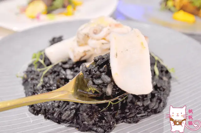 炙燒透抽墨魚燉飯,裡面有很濃的蒜香和奶味,透抽夠鮮脆,最特別的是燉飯用加拿大黑野米,是米中之王,但它不是"米",是一種草的種子喔!!很特別吧!!外殼不用經過打磨就和米粒類似,口感軟硬適中,帶有嚼勁,越吃越香甜。
