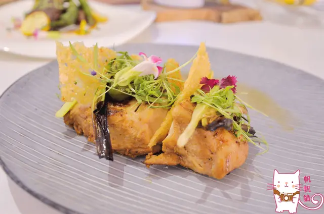 嫩煎味增雞烤珠蔥,是具有台灣風味的義式料理,雞肉是屏東萬金牧場用友善飼養法養出的雞,並淋上用手工調製的味增醬,雞皮酥脆,雞肉口感扎實有咬勁,上面灑的珠蔥其實就是紅蔥頭,是用來提味,紅蘿蔔奶油醬則讓口感更香濃。