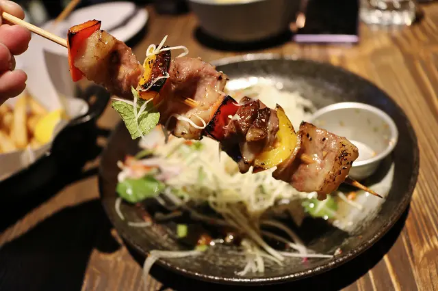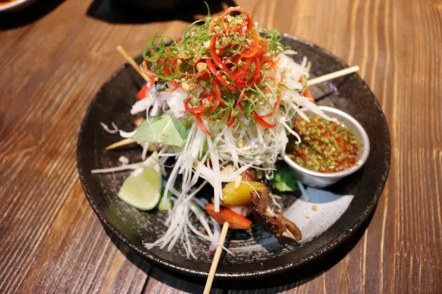 青木瓜絲切得細細的,肉串的油花偏多些,彩椒配色鮮艷,