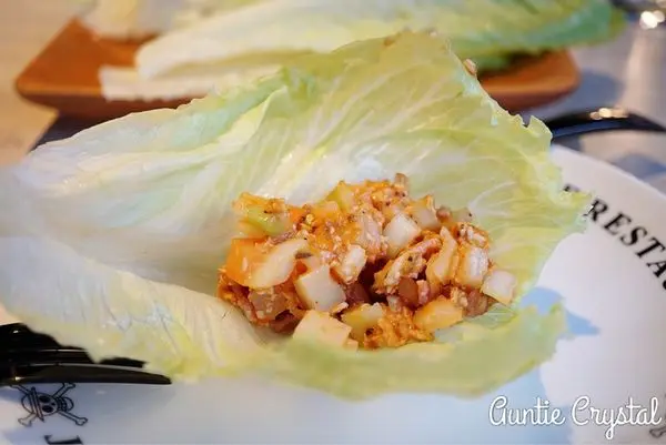沙拉裡還有加了洋蔥丁與培根增加香氣,可以與生菜包著吃,好像蝦鬆一樣,