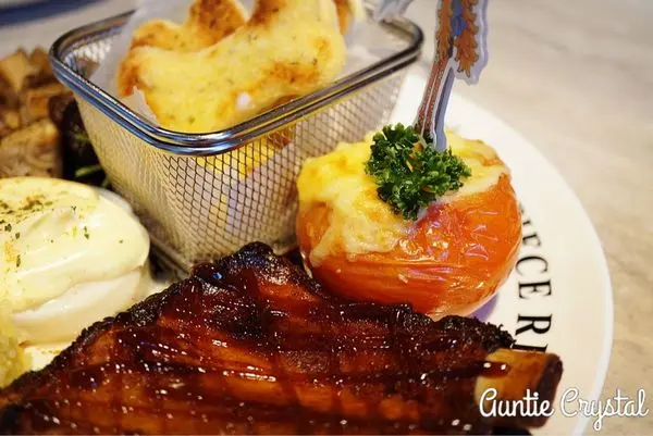 配菜有很多,炒菇、班尼迪克蛋、骨頭吐司,焗烤牛番茄。