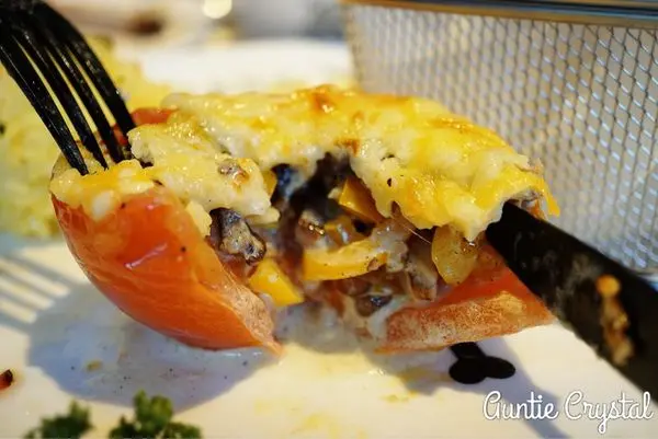 代表人物布魯克還站在飽滿的焗烤牛番茄上,這牛番茄一切下去很多汁,