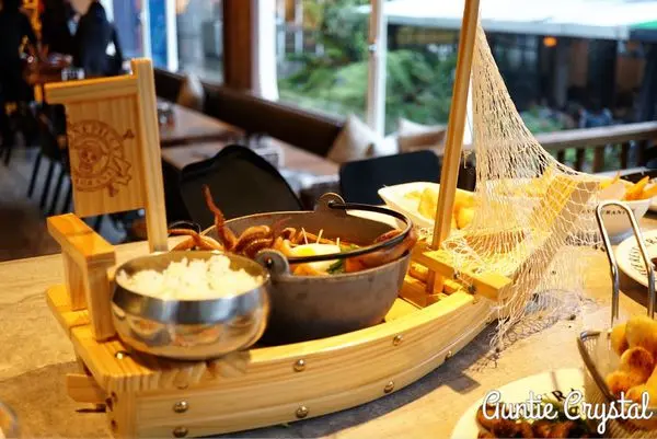 放在一艘大船上的大魷魚,另外還配了一碗白飯,