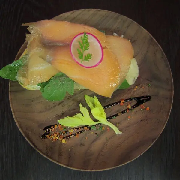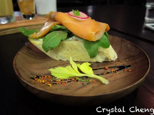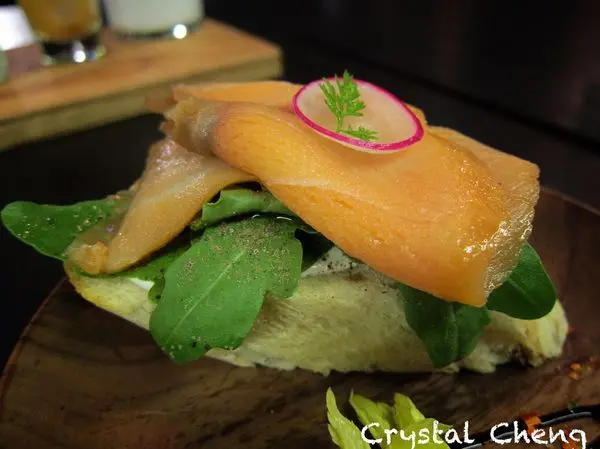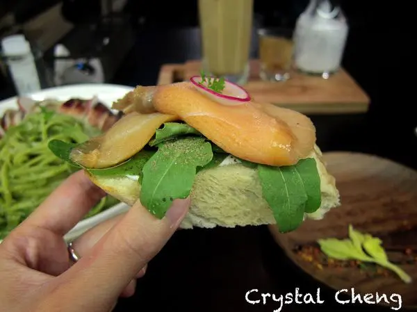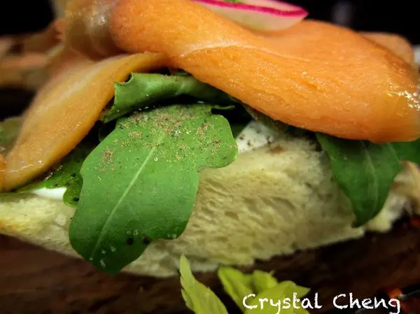 芝麻葉、煙燻鮭魚配上麵包,加上一點橄欖油,還有胡椒,