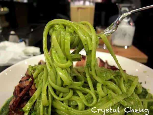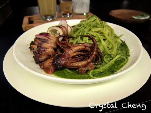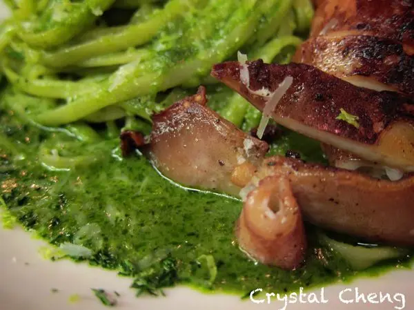 綠的可以的青醬義大利麵加上整隻炭烤透抽,