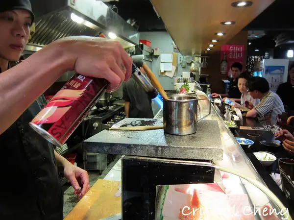 這個角度剛好可以看主廚料理食材、噴槍炙燒比目魚跟星鰻,味道超香的!