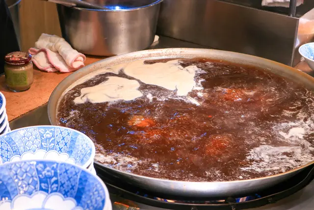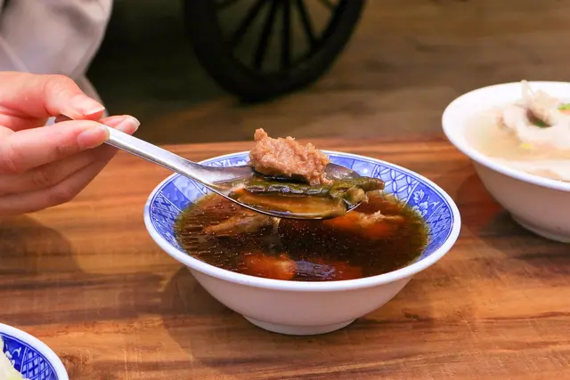 自製肉羹配上大骨湯底與花胡瓜,看上去黑嚕嚕,但喝起來卻很清爽甘甜。