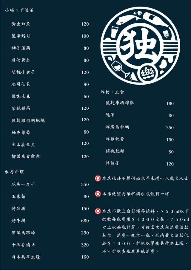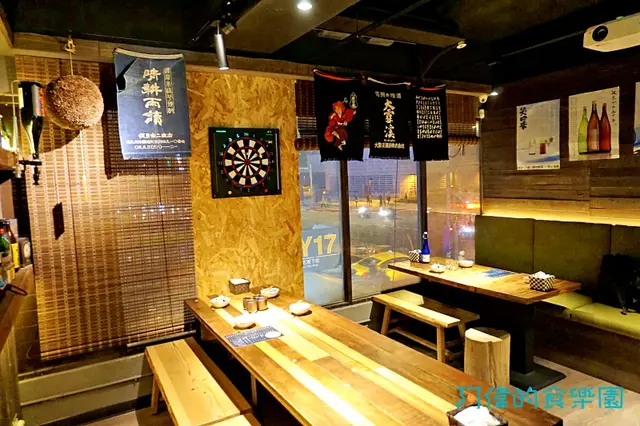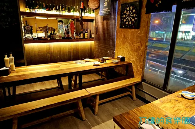 搭電梯上二樓,立刻就看見獨樂居酒屋原木構成的門面,有種一秒到日本的感覺。右上角的招牌是一個”獨”字的簡寫,周圍有酒瓶、酒杯還有一隻魚,表示有得吃也有得喝。而且就算”獨自一人來享樂”也是很天經地義的事,誰說”獨樂樂不如眾樂樂”呢?