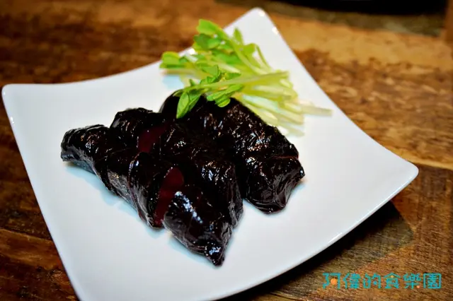 蘋果由紫蘇葉包裹後予以糖漬,吃起來味道就像是小時候吃的紫蘇糖果一樣,酸甜清香。
