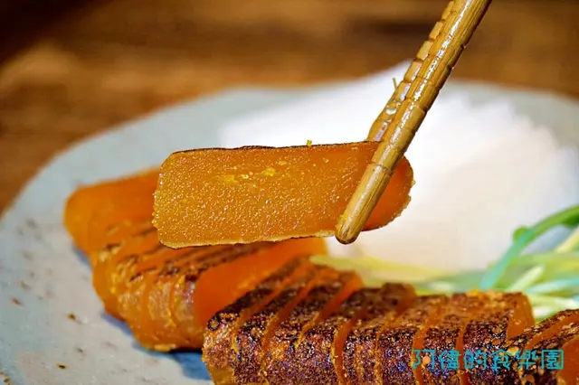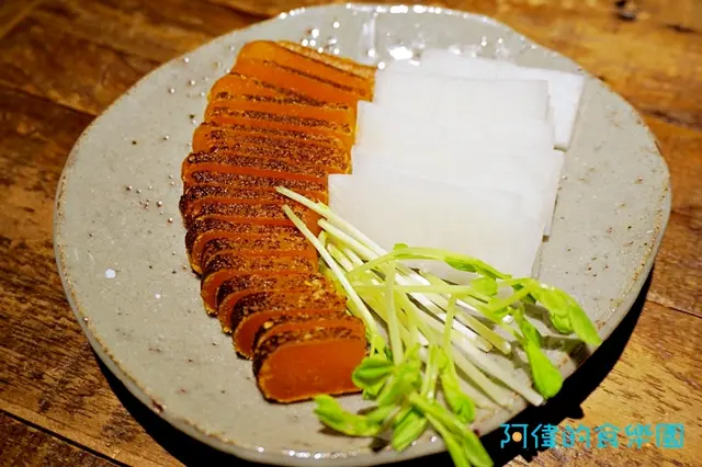 品質很好的烏魚子經過火槍炙燒,使表面有些焦香。搭配白蘿蔔、豆苗一起吃,特別清爽。