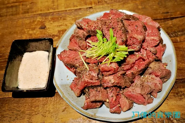 牛排上本身有些黑胡椒提出香氣,再沾一點海鹽,則甜度加倍!