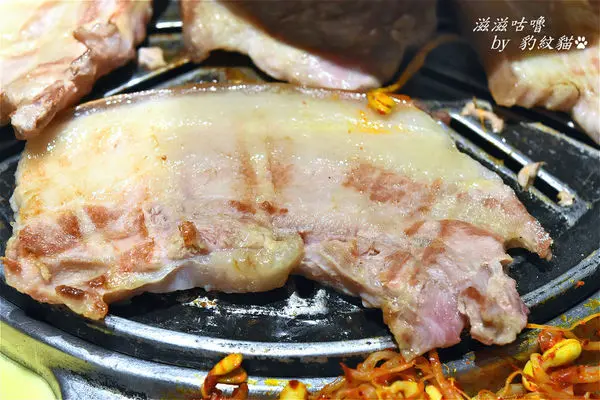 第一回合是厚切豬五花,整片豐厚的五花肉盤踞大半以上的烤盤,中間補上疑似豬頸肉一起熱烤,畫面有震撼。