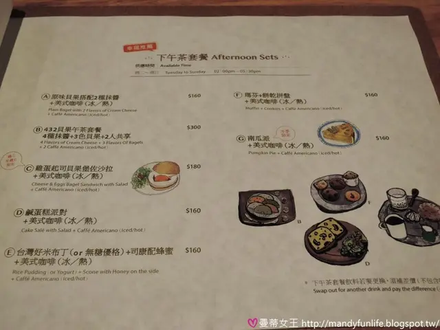 來瞧瞧菜單吧~ 除了單點貝果、糕點之外,好丘咖啡也提供幾樣組合式的下午茶套餐。