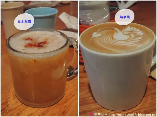 好丘的飲料選擇雖然不多,但有些飲料還滿特別的,咱們一行人都點了不同的飲料~ 弟為了養生,點了「白木耳露」,用料實在,口感濃稠,甜度適中。「熱拿鐵」,和包餡的甜貝果還挺搭配的~