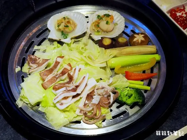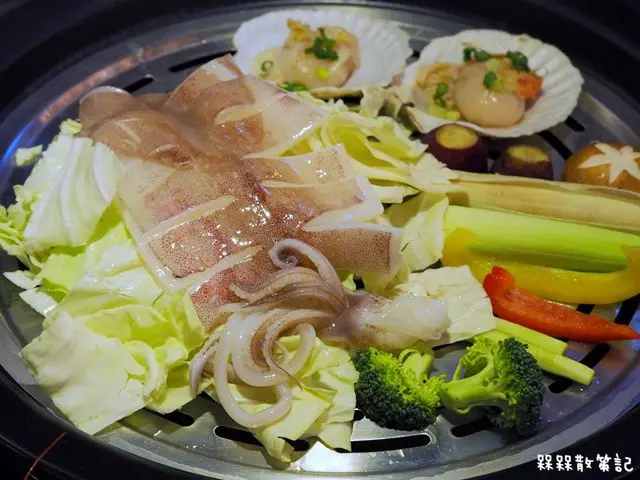 ▲蒜香扇貝 2顆、鮮凍透抽、時令蔬菜