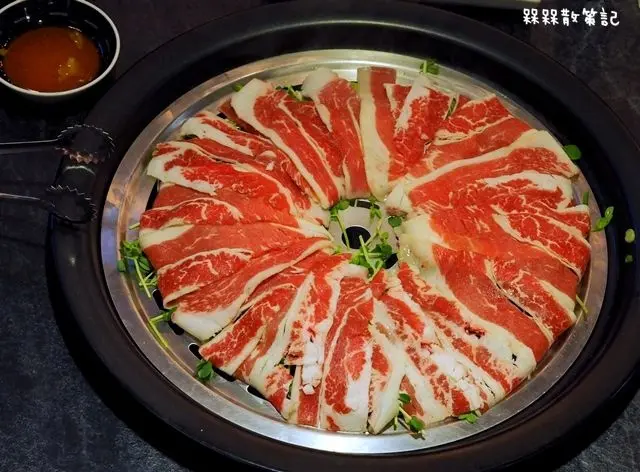 牛五花鮮紅的肉片在翠綠的小豆苗搭配下,看起來更為鮮紅亮眼。
