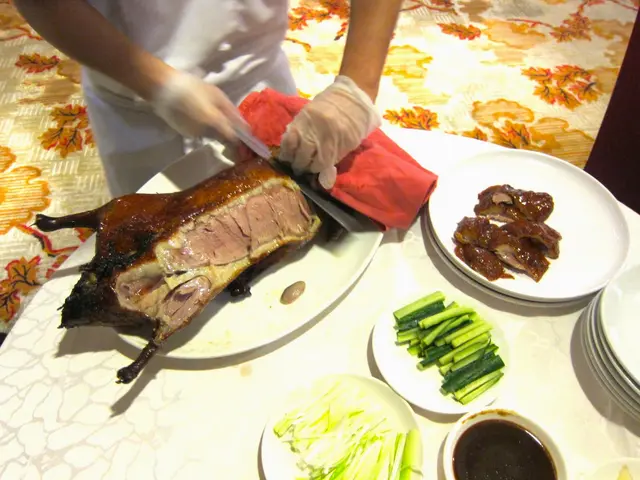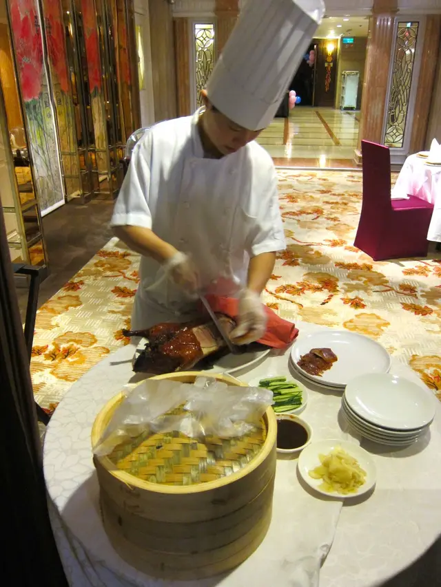烤鴨上桌前,師傅會上演桌邊秀,把桌子推到包廂門口,現場開始片皮