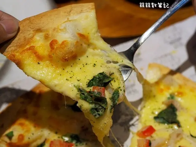 將一片Pizza拿起,甚至還能牽絲,有的部分還能拉到很長很長的細絲,起司控一定會相當喜愛。