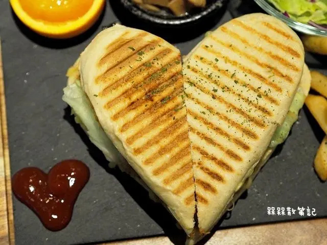 因為帕尼尼被切成兩半後,組成愛心的形狀,旁邊還沾上心型番茄醬汁。