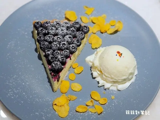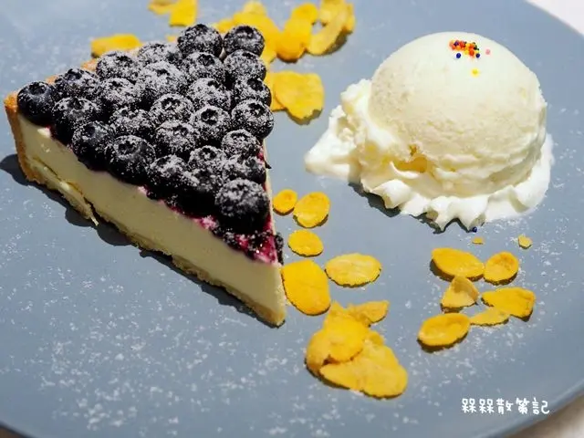 藍莓下側的乳酪塔,塔皮保有脆度,但表現並沒有特別出色。