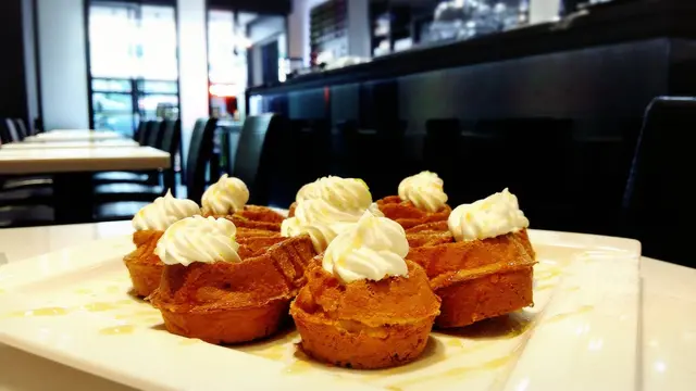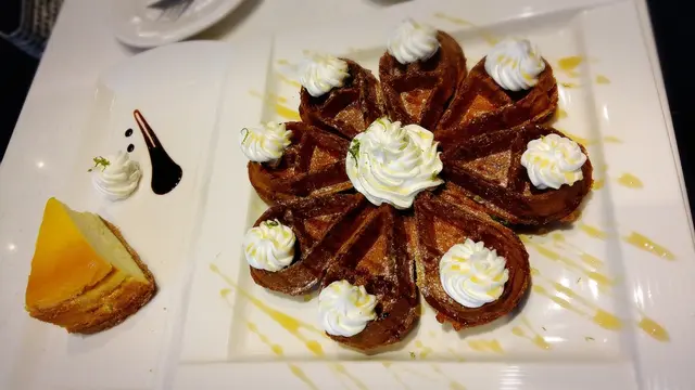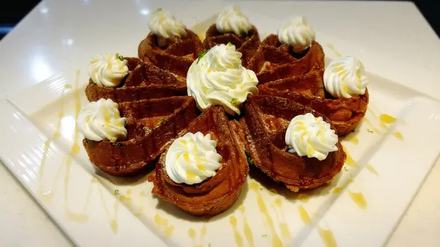 有別於一般印象中的鬆餅外觀樣式,是特別的八辦花形,也貼心地切開方便名媛貴婦拿取享用。